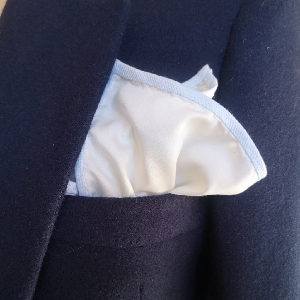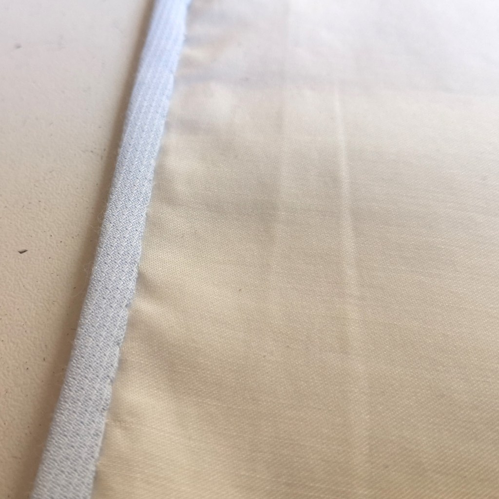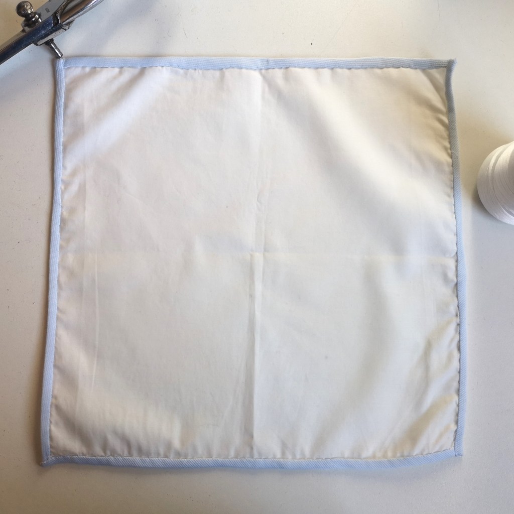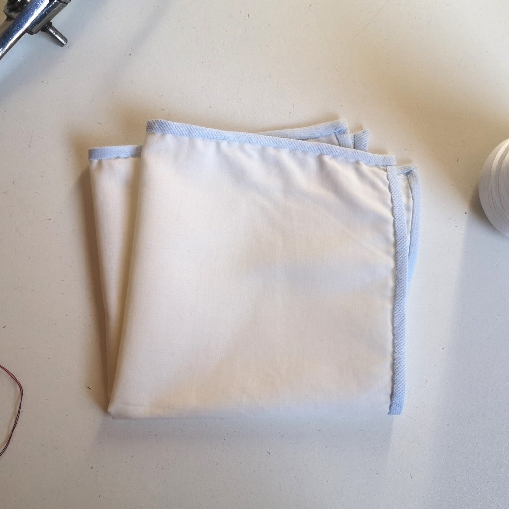 Pochette popeline upcyclée 100% coton roulotée à la main – Blanc liseré bleu ciel ou jaune – 30€